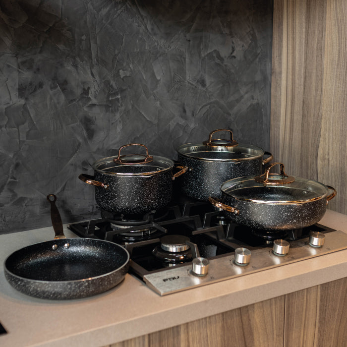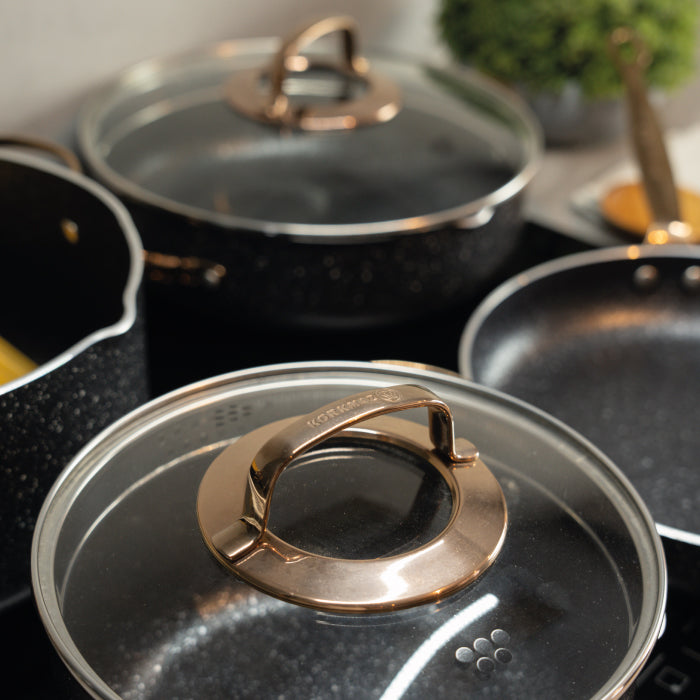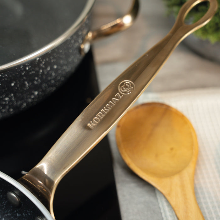 El juego de ollas Korkmaz Galaksi Rosa Gold de 7 piezas combina a la perfección la funcionalidad profesional con un diseño moderno y femenino. Con un acabado exterior en un delicado y sofisticado tono rosa dorado metalizado, esta batería de cocina se convierte no solo en una herramienta indispensable, sino en un elemento decorativo que realza cualquier espacio culinario.