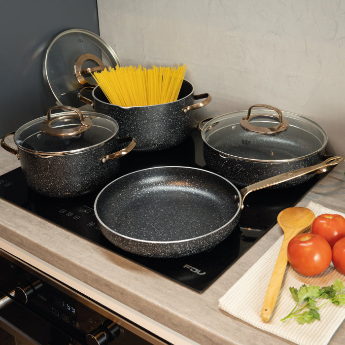 Fabricada con aluminio fundido de alta calidad, esta línea ofrece una cocción eficiente y saludable gracias a su recubrimiento interior antiadherente reforzado tipo granito, que permite cocinar con menos aceite y facilita la limpieza, incluso después de un uso intensivo.