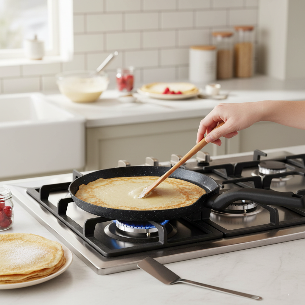 Con un diámetro ideal y bordes bajos, esta crepera facilita la distribución pareja de la masa y el volteo rápido, logrando crepes, panqueques, tortillas o wraps con resultados profesionales.