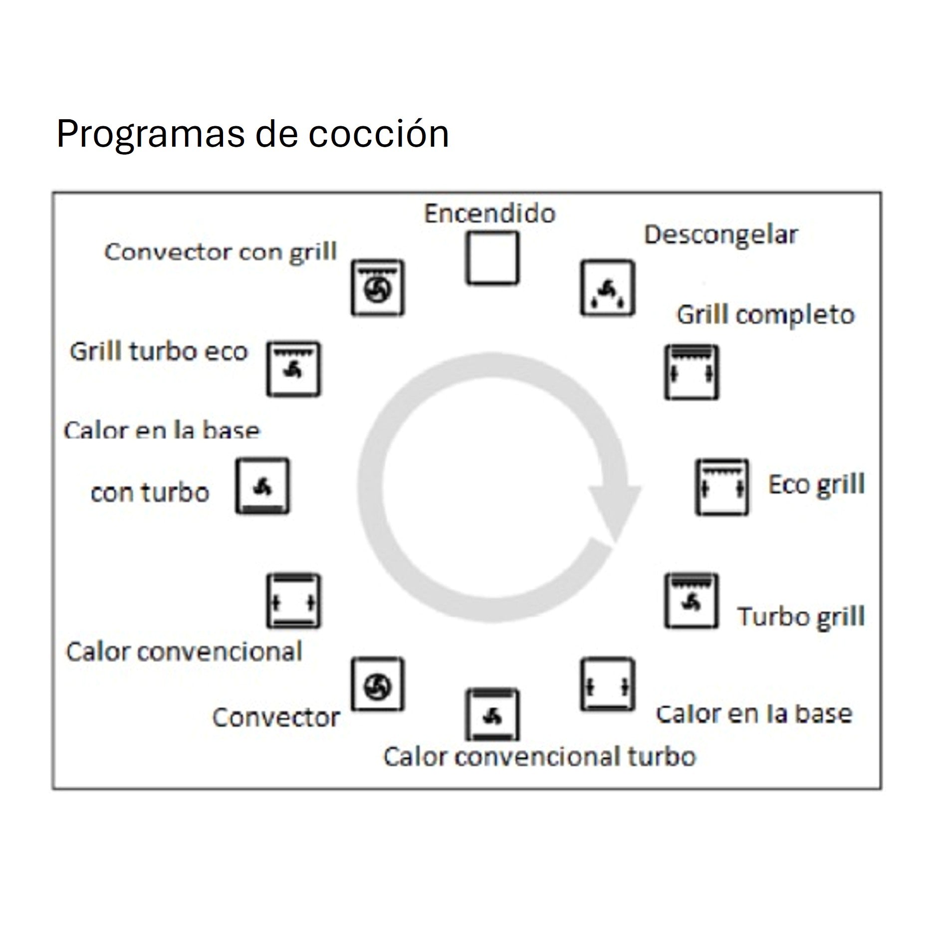 - Características Especiales Función Grill, Convector, Spiedo, Termostato de Temperatura de 50° a 250° C