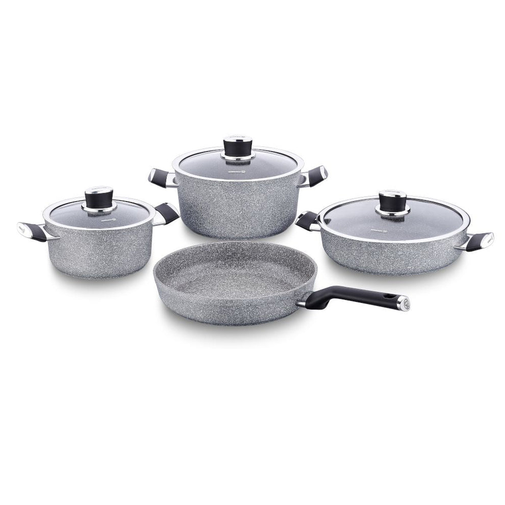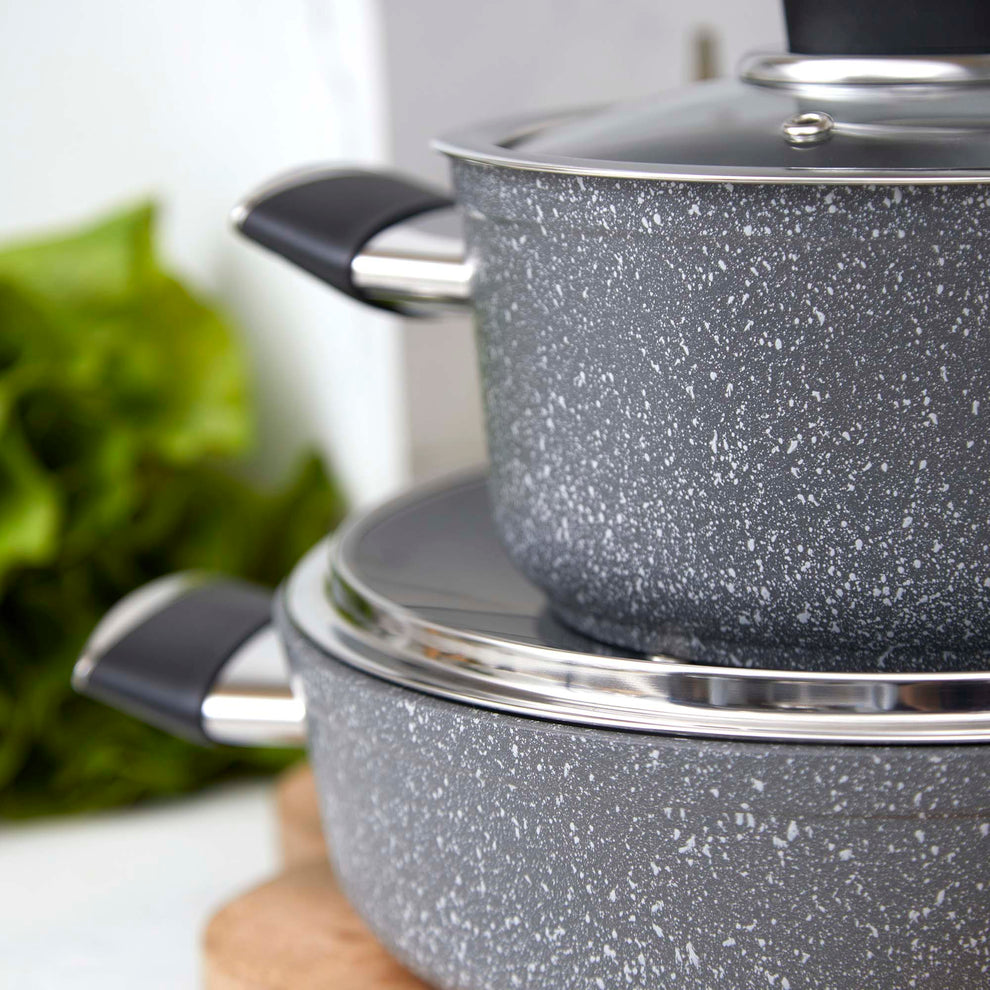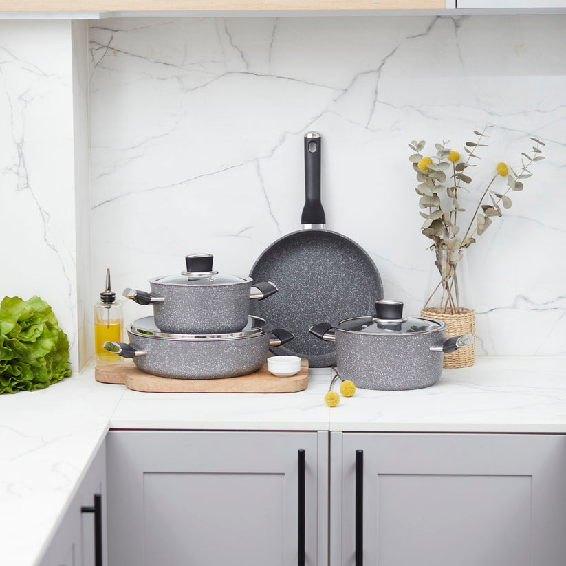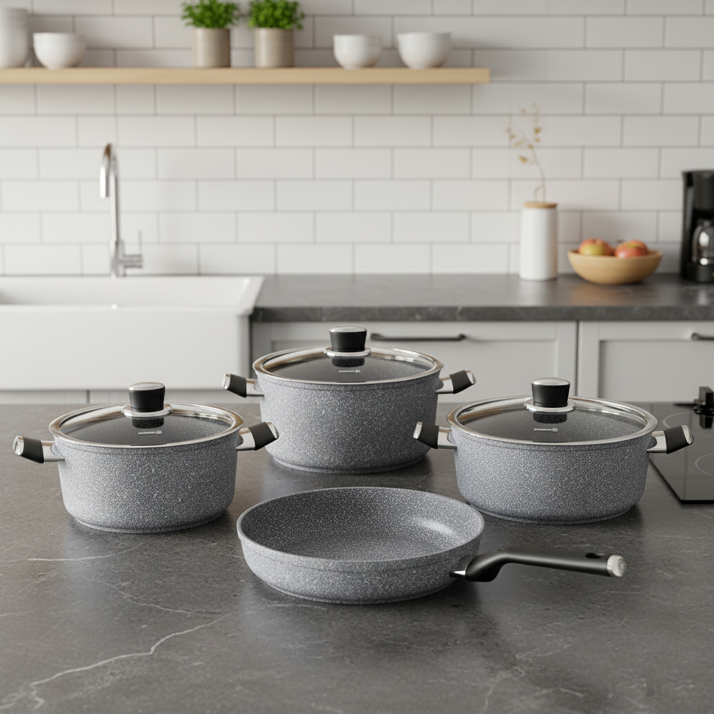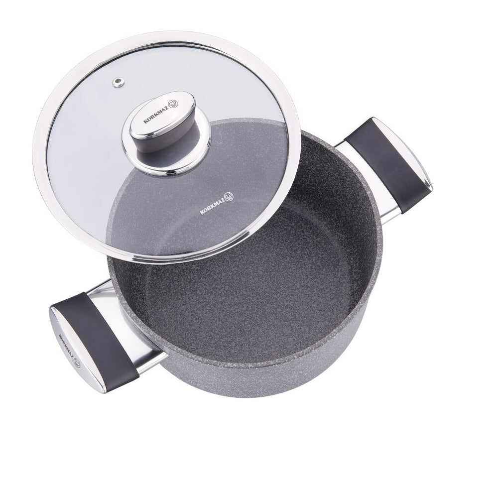 El juego de ollas Korkmaz Palma de 7 piezas es la fusión perfecta entre diseño moderno, materiales ecológicos y un desempeño de cocción eficiente y saludable. Inspirada en los tonos de la piedra natural, esta batería cuenta con un acabado exterior en color texturizado tipo granito, que no solo aporta sofisticación visual, sino que también la hace altamente resistente al uso diario.