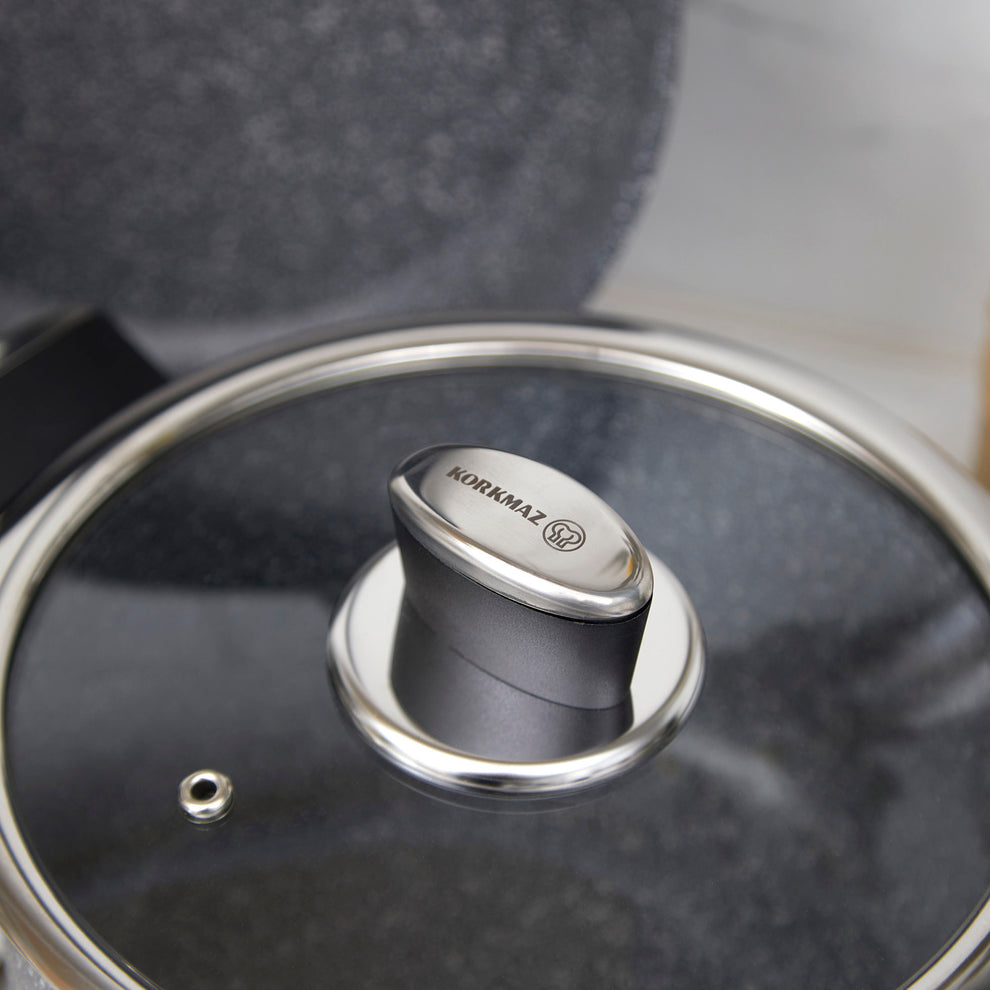 El juego de ollas Korkmaz Palma 7 piezas, cocinar es más fácil, elegante y saludable. Su diseño con acabado natural tipo granito, unido a sus materiales de calidad superior, la convierten en una opción ideal para quienes buscan eficiencia sin renunciar al estilo.