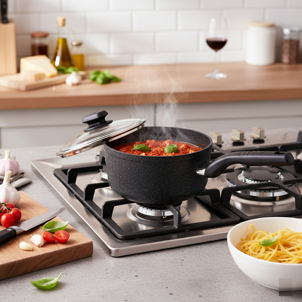 -🛡️ Tapa de vidrio resistente con mango ergonómico, que ayuda a mantener la humedad, el sabor y permite supervisar la cocción sin levantar la tapa.