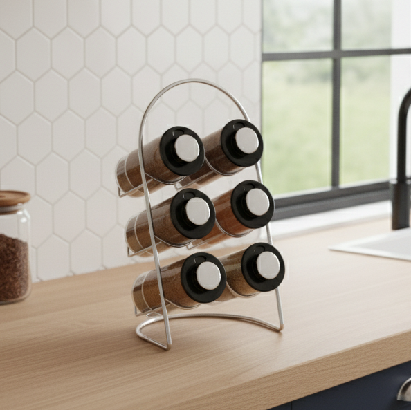-🔧 Diseño ergonómico y compacto: el soporte permite un acceso rápido a las especias sin ocupar mucho espacio