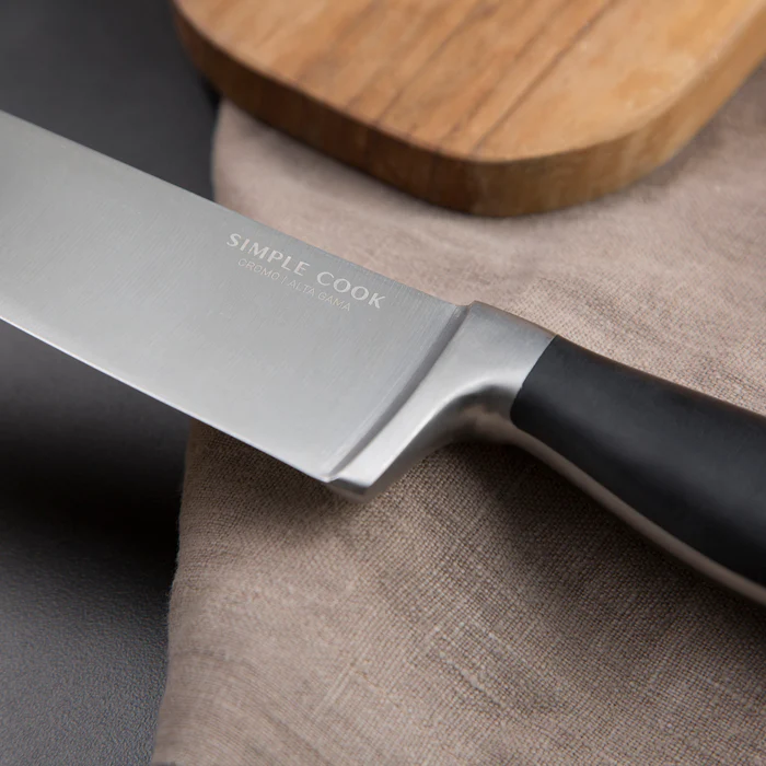Nuevo taco de cuchillos 6 pzs Boston de la marca Simple Cook. Este modelo incluye 5 cuchillos y un taco de madera, de gran durabilidad. Sus mangos son cubiertos con sistema antideslizantes y sus cuchillos con hoja de acero inoxidable 3Cr13. Los cuchillos de tipo Chef de 8”, de pan de 8”, fileteador de 8”, multiuso de 5” y pelador de 3.5”, serán de gran ayuda en tu cocina